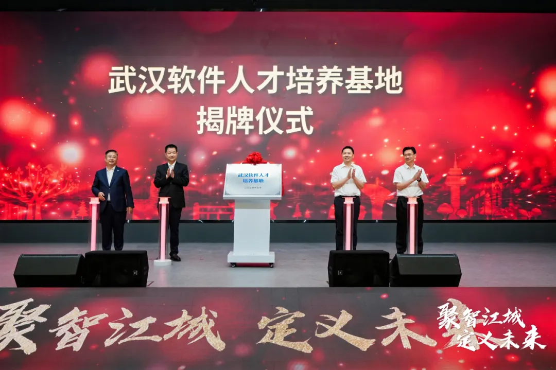 在典礼上,武汉经开区管委会主任唐超、江汉大学校长景新华、武汉商学院校长彭瑜、九州酷游教育高级副总裁李印杲还共同为武汉软件人才培养基地揭牌。