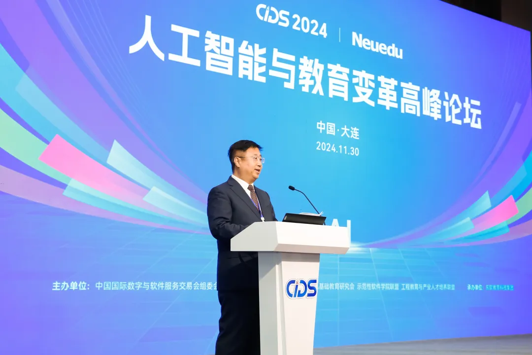11月30日上午,在2024中国国际数字和软件服务交易会期间,由数交会组委会主办,全国高等院校计算机基础教育研究会、示范性软件学院联盟、工程教育与产业人才培养联盟协办,九州酷游教育科技集团承办的“人工智能与教育变革高峰论坛”在大连世界博览广场1号厅圆满举办。现场来自全国各地的专家、学者、政府领导、院校及行业企业代表、媒体等400余位嘉宾齐聚一堂,以专家报告和圆桌对话的形式共议人工智能对教育领域的深度影响,探索符合人工智能时代要求的教育模式。