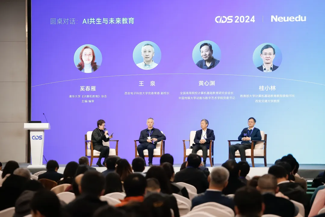 本次高峰论坛特设以“AI共生与未来教育”为主题的圆桌对话,从学生、教师、学校等角度全面探讨人工智能为教育带来的机遇与挑战。该环节由清华大学《计算机教育》杂志主编、编审奚春雁主持。黄心渊教授,桂小林教授,西安电子科技大学党委常委、副校长王泉等嘉宾,针对活动前期征集的代表性问题做出精彩解答,取得阵阵掌声。在现场提问环节,来自全国高校的教师代表争相发问,现场气氛热烈。