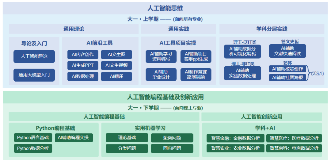 面向全校文理科各专业,秉承从应用中来,到实践中去的原则,课程内容将涵盖人工智能的基础知识、技术原理、DeepSeek及其他AI工具在人工智能内容生成(AIGC)的应用及实践、学科分层实践,Python编程基础、实用机器学习及人工智能创新应用。配套完整的教材、微课视频、试题库、教学设计及教学案例,整体方案如下: