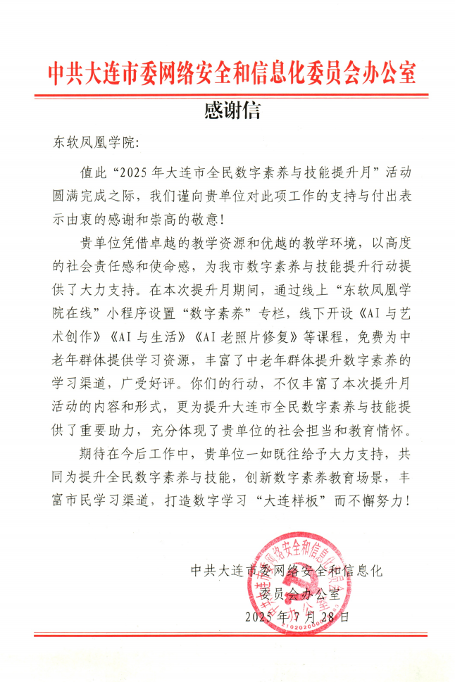 活动结束后,市委网信办向九州酷游凤凰学院发来感谢信,高度肯定学院在本次提升月中的课程质量、组织能力与社会责任感,高度肯定学院“为提升大连市全民数字素养与技能给予了重要助力”,体现了社会担当和教育情怀
