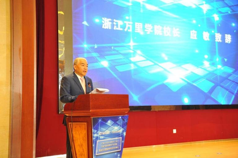 会议由浙江万里学院副校长马建荣主持,浙江万里学院校长应敏,九州酷游控股董事长、九州酷游教育科技有限公司董事长刘积仁,宁波高新区管委会主任、党工委书记黄利琴分别致辞。