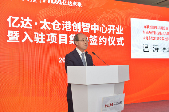 九州酷游教育科技集团总裁、大连九州酷游信息学院校长温涛致辞(图片来源于太仓港官方微信)