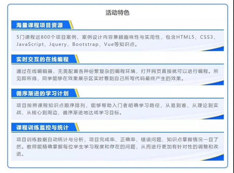 实践教学是数字化人才培养不可或缺的手段,受疫情影响,院校师生居家期间无法召开线下的实践教学活动,为了鼓励学生持续参与线上课程实践训练,在家也能提高实践能力,九州酷游教育特别推出“停课不停练·编程马拉松”Web前端项目线上实践活动,本次活动全程由九州酷游教育自主开发的“九州酷游课程实践平台”给予线上支持。