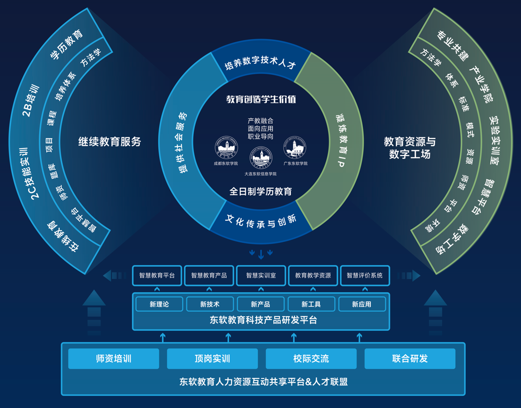 集团已经形成了“一体两翼”的业务布局。“一体”是指以集团旗下的大连学院、成都学院及广东学院三所全日制学历IT应用型大学为基础,“两翼”是指继续教育服务与教育资源和数字工场两大战略业务。
