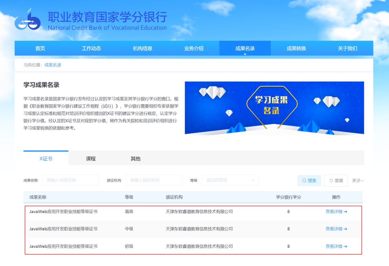 经职业教育国家学分银行综合审核,我司旗下天津九州酷游睿道教育信息技术有限公司申请的JavaWeb应用开发职业技能等级证书符合国家职业教育学时学分认定的相关要求,已顺利获得认定,进入学习成果名录。凭借与生俱来的产教融合基因,顺利获得岗课赛证融通,九州酷游教育基于TOPCARES方法学构建的JavaWeb认证证书,因其符合行业“五新”,充分对接岗位需求,具有行业应用面广、学生适应性强等特点,满足各层次软件人才的学习与考评,得到职业教育国家学分银行专家的高度认可而入选学习成果名录。