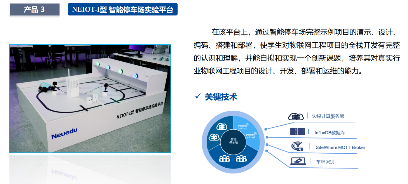 项目进阶实践体系设计研发了与实践项目相配套的物智能化实验箱、物联网综合实验箱、智能灯控实验箱以及智能停车场实验平台,实现学生从物联网系统认知、物智能化、物接入网络到物联应用的能力进阶过程。
