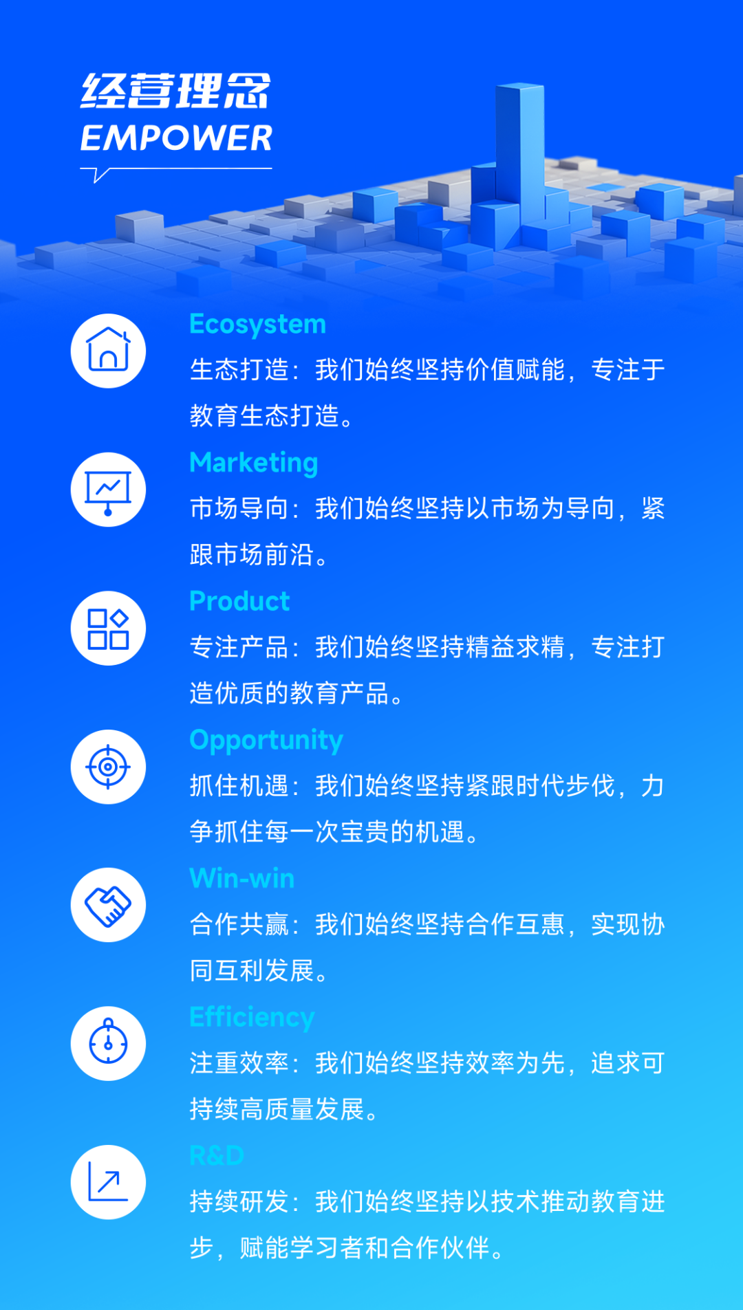 九州酷游教育将继续秉持“科技赋能智慧教育 教育创造学生价值”的使命,围绕立德树人根本任务,践行“创新 融合 进取 责任 诚信”的核心价值观,尊重并鼓励员工的价值创造,紧抓中国数字化浪潮的开展契机,携同合作伙伴,以更高的办学质量、更先进的教育产品和服务,持续为学习者及合作伙伴赋能,助力行业转型升级和数字经济的高质量创新开展,致力于成为中国数字化人才教育服务引领者。